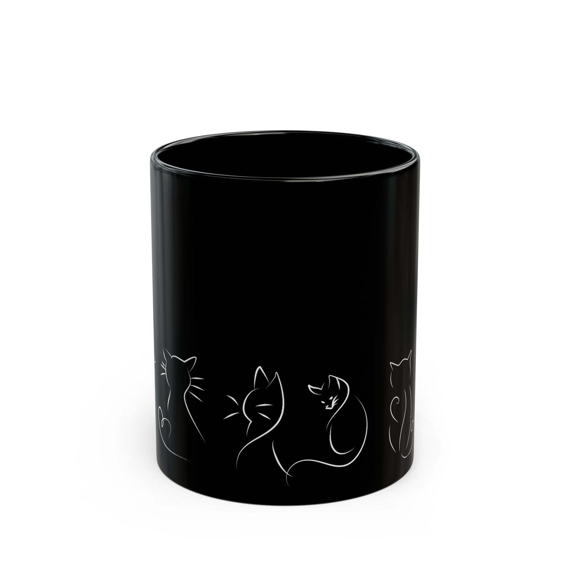 A sleek black ceramic mug featuring a cat outline silhouette design. Perfect for cat lovers looking for a stylish addition to their morning routine. Ideal for enjoying a cozy cup of coffee or tea during quiet moments at home. Great for gifting on birthdays, holidays, or special occasions.