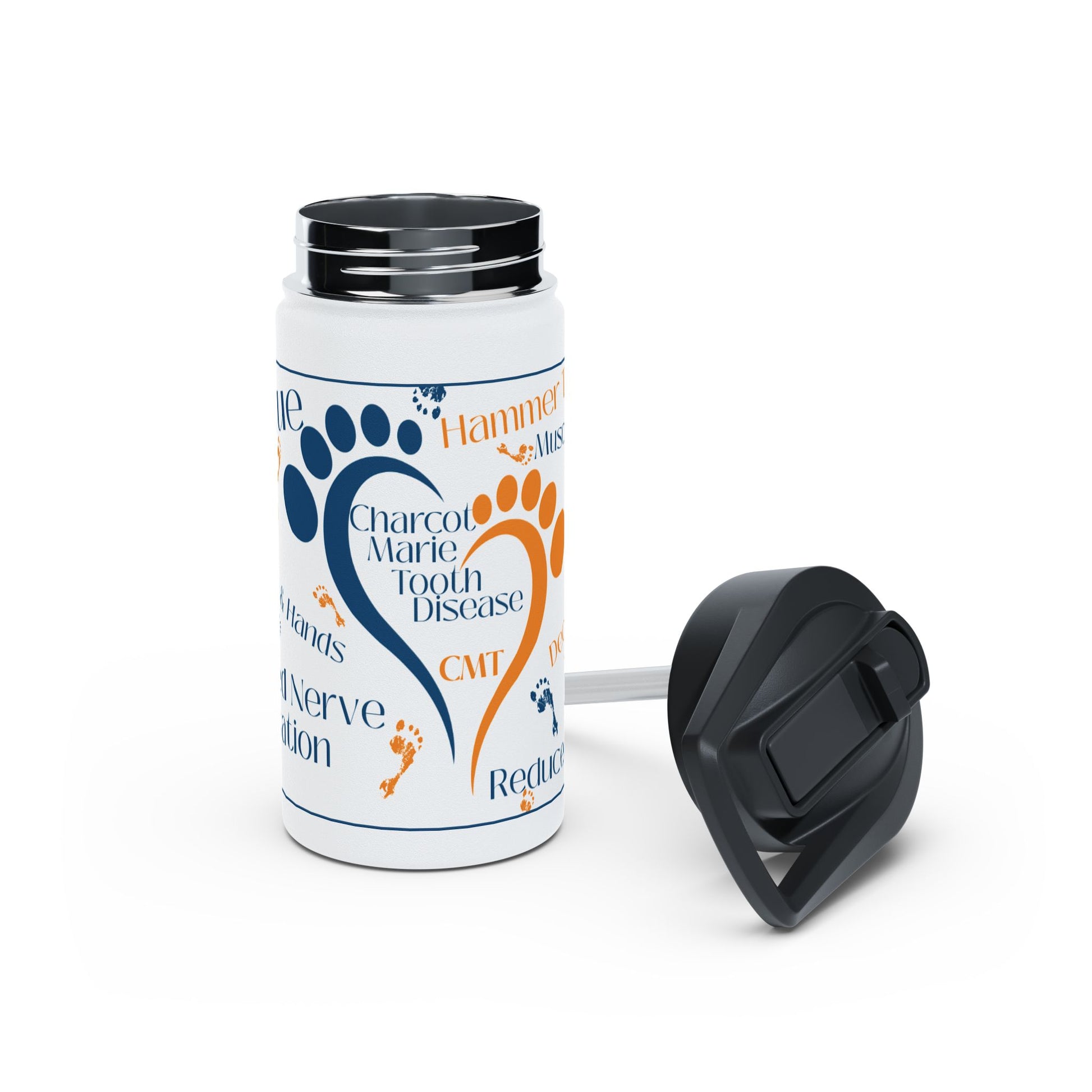 Stay hydrated in style with this stainless steel water bottle featuring CMT awareness and symptoms. Perfect for those who are passionate about raising awareness for CMT and keeping their drinks at the perfect temperature. Ideal for CMT warriors, supporters, and advocates. Great for CMT Awareness Month, support group meetings, fundraising events, and everyday use.